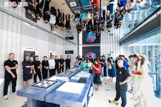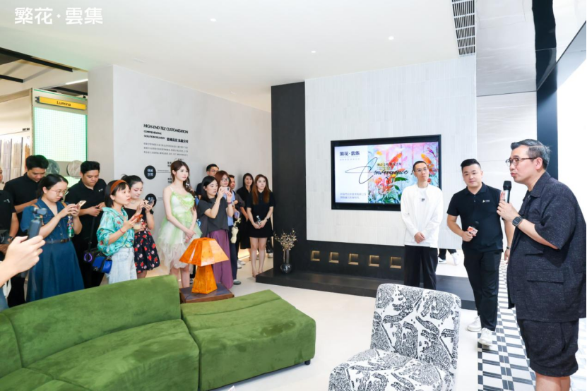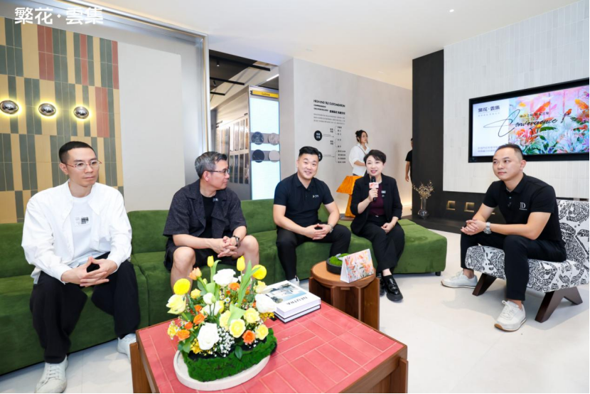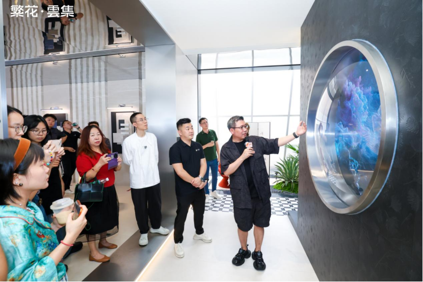 伴随着倒数声,佛山市繁花印象陶瓷有限公司总经理&「繁花·雲集」主理人 伍尚志先生ID瓷砖 主理人 申志远先生、繁花艺术砖 主理人焦秋荣 先生、繁花艺术砖 销售副总经理严剑城 先生、佛山中陶城集团副总裁—汤洁明女主、瑞坤国际·正方良行设计首席设计师—徐庆良先共同按下启动按钮,升腾的水雾象征着品牌美学的延展,绽放的繁花代表着「繁花·雲集」的美学宇宙正式开启。