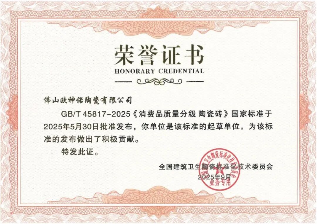 2025年12月1日,GB/T 45817-2025《消费品质量分级 陶瓷砖》国家标准将正式实施,标志着我国陶瓷砖行业迈入"等级化品质时代"。在此行业变革节点,欧神诺瓷砖传来双重喜讯:其送检产品于近日率先通过国家级检测机构检测,符合新国标最高等级AAAAA级要求;同时,作为该标准的起草单位之一,欧神诺获颁官方荣誉证书,以双重身份彰显头部企业的技术实力与行业担当。