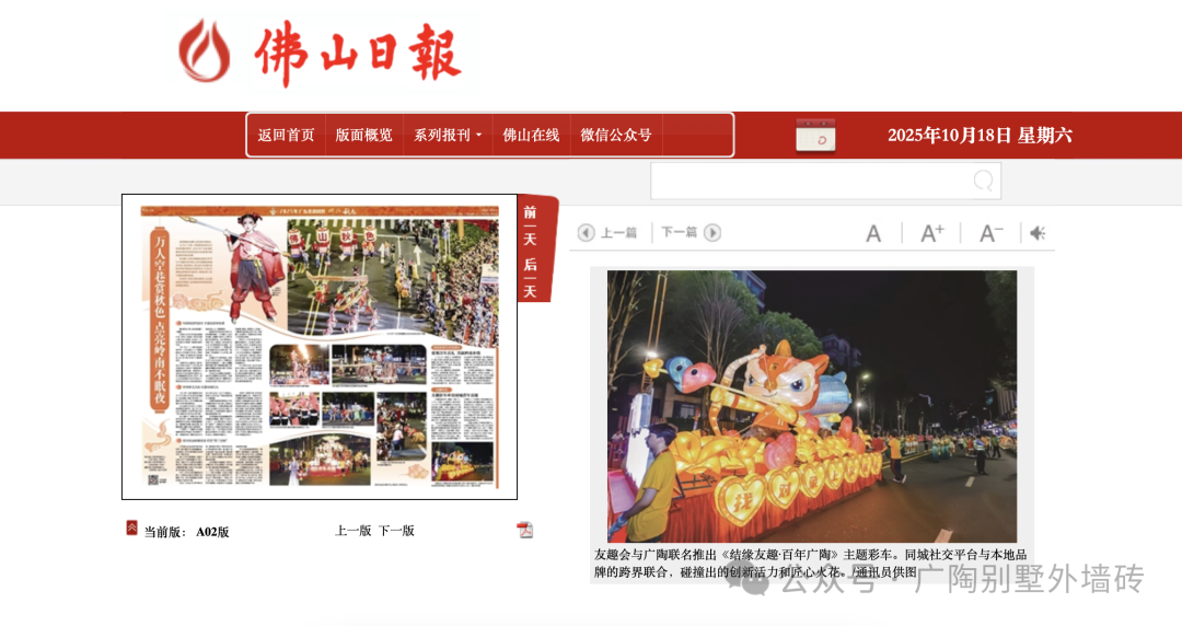 此次佛山秋色巡游,是广陶与友趣会的又一次跨界合作。此前,在广陶2025秋季新品发布会上双方推出联名文创产品,并发布了“结缘友趣,百年广陶”系列活动。广陶以“百年技艺”守护佛山非遗文脉,又以“时尚外装”赋能新农村建设;友趣会则以“兴趣破圈”连接青年生活,让每一次相遇都充满可能。广陶的百年匠心与友趣会的跨界活力碰撞,解锁品牌升级全新可能,为双方品牌注入成长新动能。