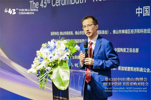 会议伊始,佛山中国陶瓷城集团有限公司联席董事长兼总裁 周军发表致辞,对远道而来的澳大利亚、菲律宾、新加坡、柬埔寨、马来西亚、越南、缅甸等RCEP国家商协会会长及建材贸易商致以热烈欢迎。中国(佛山)陶博会作为国际性商贸盛会,是中国陶瓷走向世界、世界洞察中国陶瓷产业的重要桥梁。RCEP作为全球最大自由贸易区,亦是中国瓷砖卫浴出口的关键市场。希望借此盛会,各位客商能与国内陶瓷卫浴企业深入交流,共拓产品贸易,探寻投资合作新机遇。